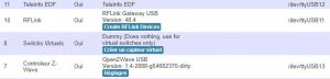 On va donc retrouver sur l’entrée usb11 un rflink (idVendor 2341 et idProduct 0042), sur l’entrée usb12 un dongle Cartelectronic pour mesurer la production photovoltaïque ou la consommation électrique (ID_VENDOR Cartelectronic), sur l’entrée usb13 un dongle zwave (idVendor 0658 et idProduct 0200), sur l’entrée usb14 un rfxcom (ID_VENDOR RFXCOM).
