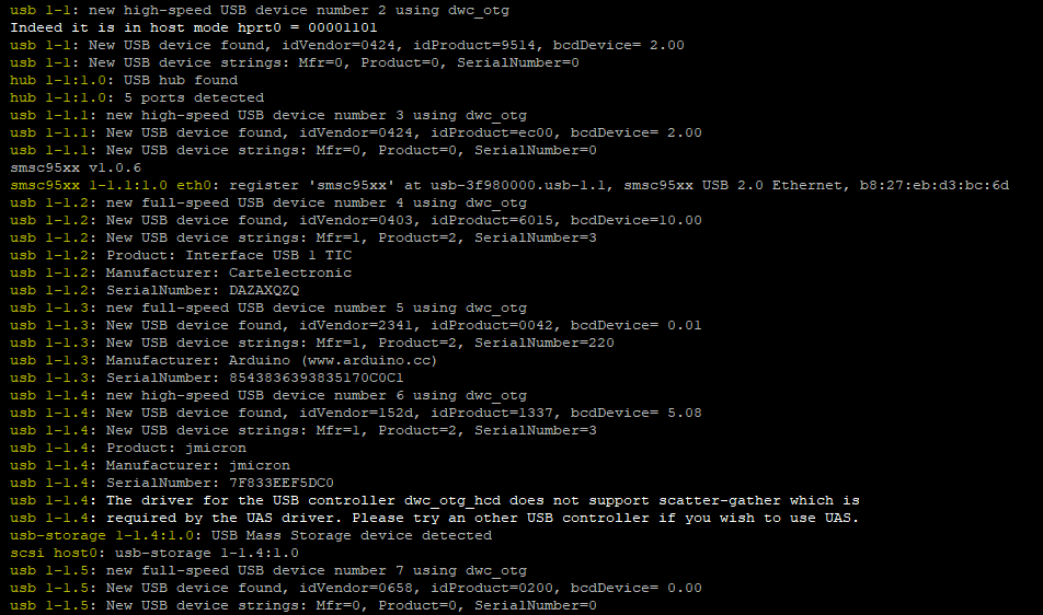 On va donc retrouver sur l’entrée usb11 un rflink (idVendor 2341 et idProduct 0042), sur l’entrée usb12 un dongle Cartelectronic pour mesurer la production photovoltaïque ou la consommation électrique (ID_VENDOR Cartelectronic), sur l’entrée usb13 un dongle zwave (idVendor 0658 et idProduct 0200), sur l’entrée usb14 un rfxcom (ID_VENDOR RFXCOM).