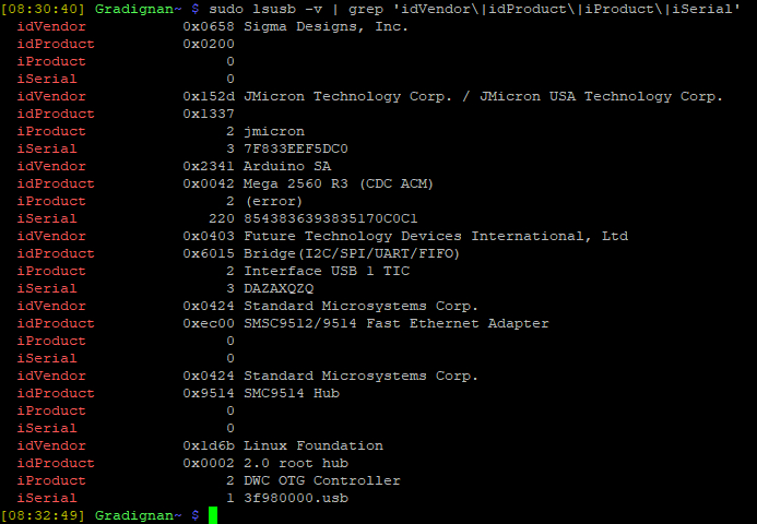 sudo lsusb -v | grep ‘idVendor\|idProduct\|iProduct\|iSerial’