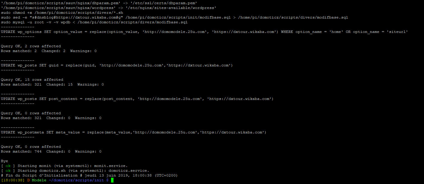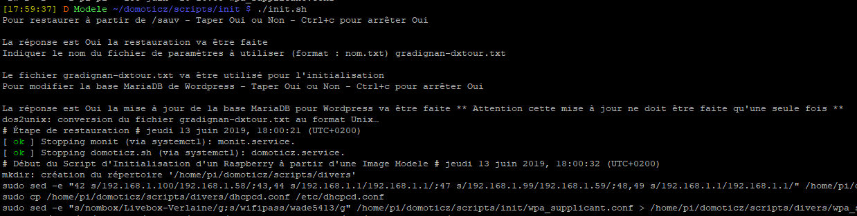 - Depuis Putty, se positionner dans /home/pi/domoticz/scripts/image/init et lancer l’initialisation (cd /home/pi/domoticz/scripts/image/init + ./init.sh). Pour la première initialisation, choisir la restauration depuis /sauv et la mise à jour de la base MariaDB utilisée par WordPress (ne faire cette dernière opération qu’une seule fois).