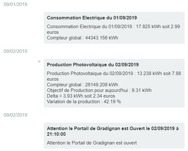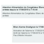 3.  Les mails qui ont plus un rôle de contrôle et d’historisation des informations (consommation électrique, production photovoltaïque, bilan d’alarme, compte-rendu d’exécution des shells). Dans cet article, il y a des exemples des mails envoyés par la crontab.