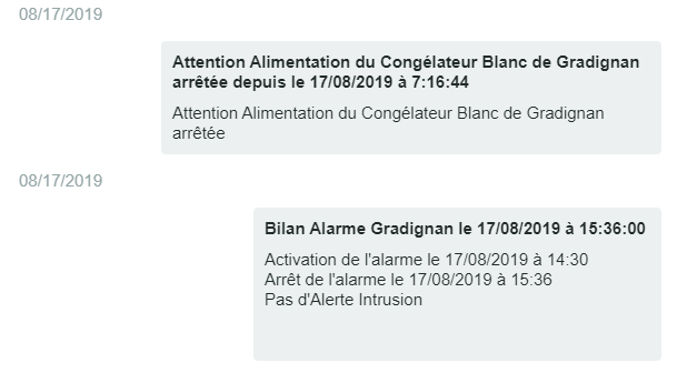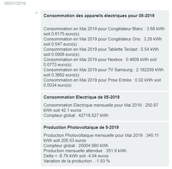 - Les mails qui ont plus un rôle de contrôle et d’historisation des informations (consommation électrique, production photovoltaïque, bilan d’alarme, compte-rendu d’exécution des shells). Dans cet article, il y a des exemples des mails envoyés par la crontab.