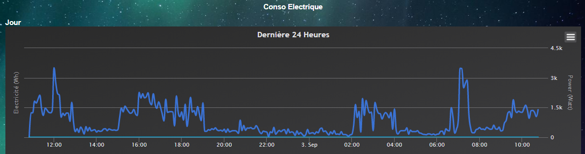 On peut remarquer la consommation significative de la pompe de piscine entre 2h et 4h du matin, 10h et 13h puis 15h/19h. Il a aussi du fer à repasser et du sèche cheveux entre 7h et 8h et de la cuisine entre 12h et 13h.