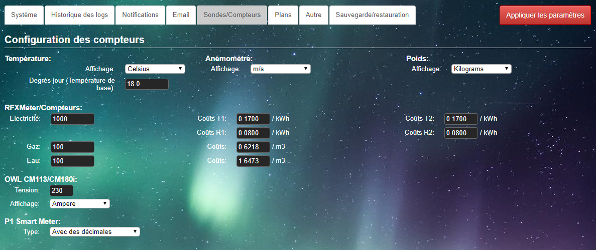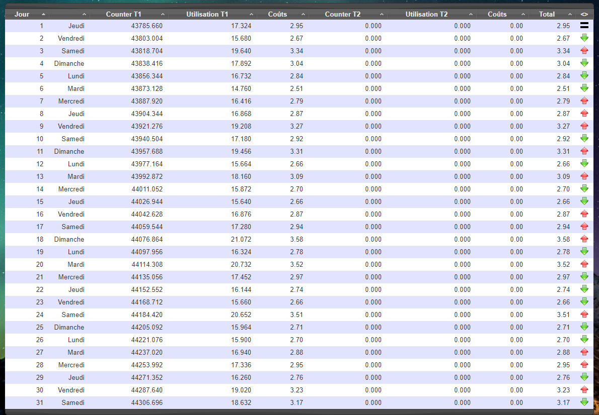 Pour le calcul du coût, j’utilise Domoticz en valorisant le prix du kWh dans les paramètres. Pour avoir un coût représentatif, je divise simplement ma facture annuelle par ma consommation en kWh, ainsi j’inclue toutes les taxes additionnelles dans le prix du kWh.