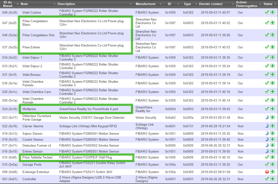 J’ai trois types de prises qui peuvent surveiller l’alimentation et la consommation électrique, toutes en Z-Wave, 3 NEO Coolcam, 1 Fibaro et une multiprise avec 6 prises GreenWave. J’ai aussi des prises pilotées Xiaomi en ZigBee mais je n’ai pas testé cette fonctionnalité (je ne sais pas si elle est disponible).