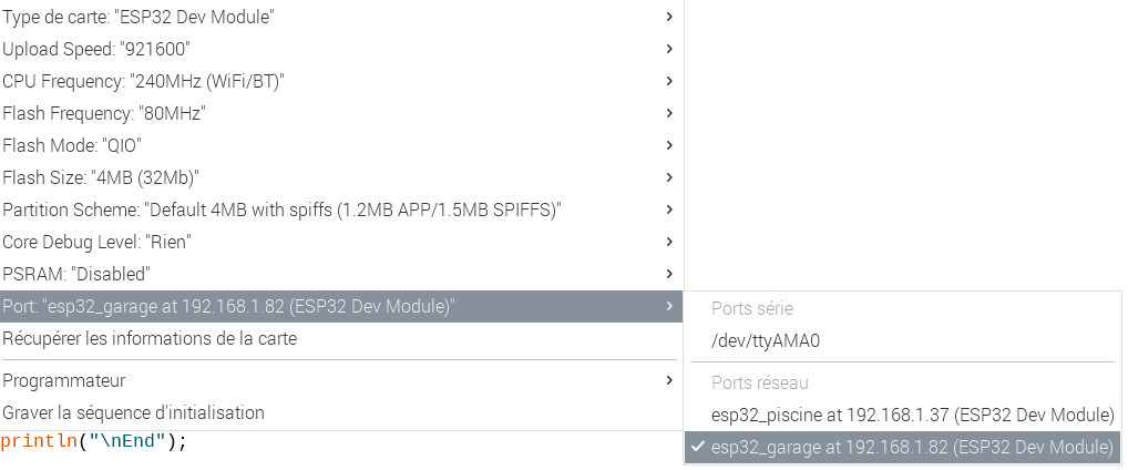 Après l’ajout de ce module OTA sur votre ESP32, un nouveau port de connexion apparaîtra avec le nom que vous avez donné à votre ESP et son adresse IP. C’est ce port réseau qu’il faudra sélectionner pour les prochaines mises à jour en OTA.