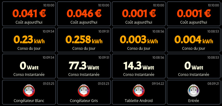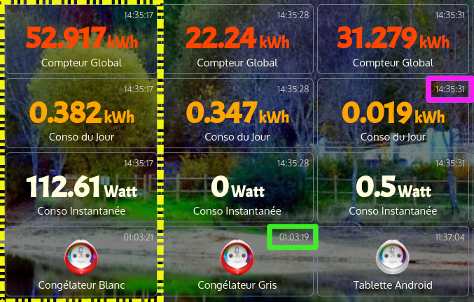 Dans cette partie de l’écran, je souhaite avoir une vision générale de la consommation électrique de mes congélateurs. Sur la ligne du bas, je vois mes prises, qui sont actives (je suis rassuré 😉 ); la charge de la tablette est inactive par contre. Dans le rectangle en pointillés jaunes, je peux voir le compteur global de consommation du congélateur blanc, la consommation du jour et la conso instantanée. Lors de la copie d’écran, le congélateur gris n’était pas dans une phase de consommation. En haut à droite de chaque case, j’ai l’heure de la dernière mise à jour (ou bien la date et l’heure si la mise à jour n’a pas été faite dans la journée). Dans le petit rectangle vert, il y a 1:03, c’est l’heure de redémarrage de Domoticz cette nuit et depuis la prise à toujours été active. Dans le rectangle violet, c’est l’heure de la dernière mise à jour de la conso du jour pour la charge de la tablette android. J’ai choisi les polices, les tailles et couleurs d’affichage des compteurs en fonction de mes envies, ainsi que les icônes pour les prises.