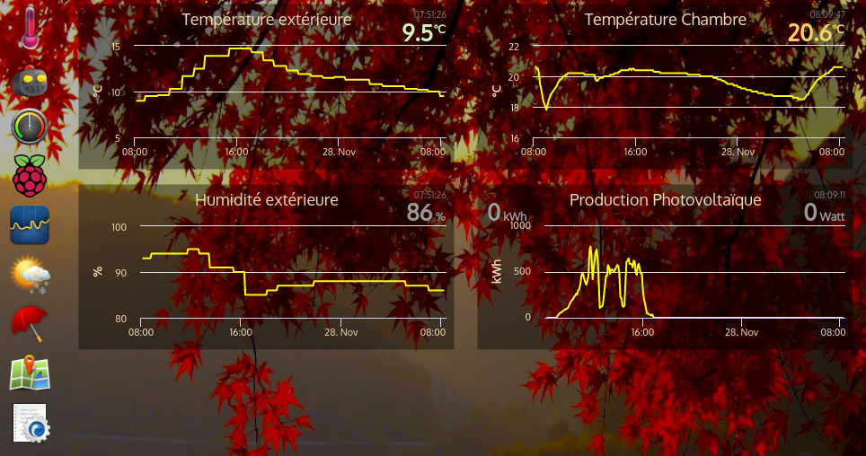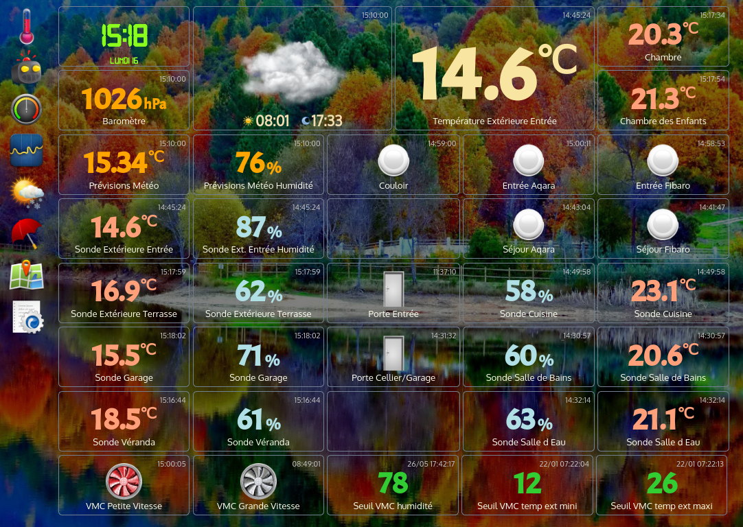 Ma page d’accueil de Monitor avec sur la gauche les icônes qui permettent la navigation vers les autres pages, sur tablette on peut faire un balayage avec le doigt pour passer d’un écran à l’autre. Le fond d’écran (chacun peut choisir le sien) change en fonction de l’heure (jour/nuit) et de la saison.