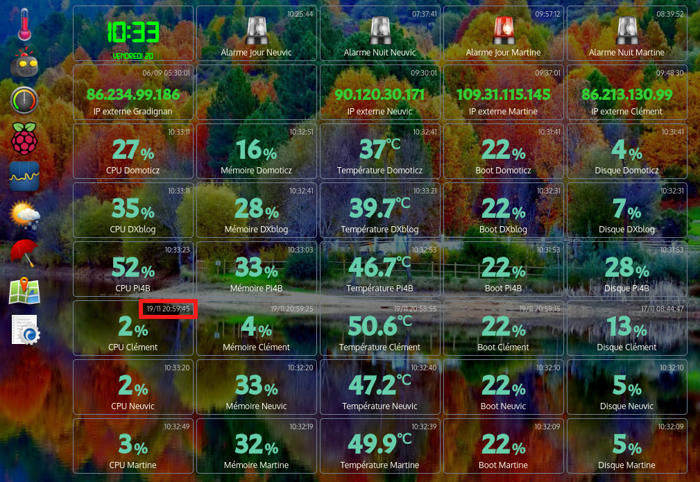 Avec les informations rassemblées sur cette page, j’ai une vision globale du fonctionnement de tous les raspberry que je suis. Sur la première ligne, je vois la situation pour les alarmes avec les heures d’activation/arrêt. Les deux lignes du bas indiquent le fonctionnement des raspberry « Alarme » qui ne sont pas trop chargés ! Toute la colonne des 22%, c’est le pourcentage d’occupation de la partition de boot; il est identique partout puisque c’est la même image qui est utilisée. Par contre dans la colonne de droite, on peut voir que le pourcentage d’utilisation du disque est variable car les disques n’ont pas tous la même taille et les Pi qui sont utilisés en bureautique (Pi4B pour moi et le Pi de Clément) utilisent plus d’espace disque à cause des logiciels installés. Sur la deuxième ligne, j’ai mis les adresses IP externes, c’est utile pour pouvoir se connecter lorsque les dns ne sont pas mis à jour.