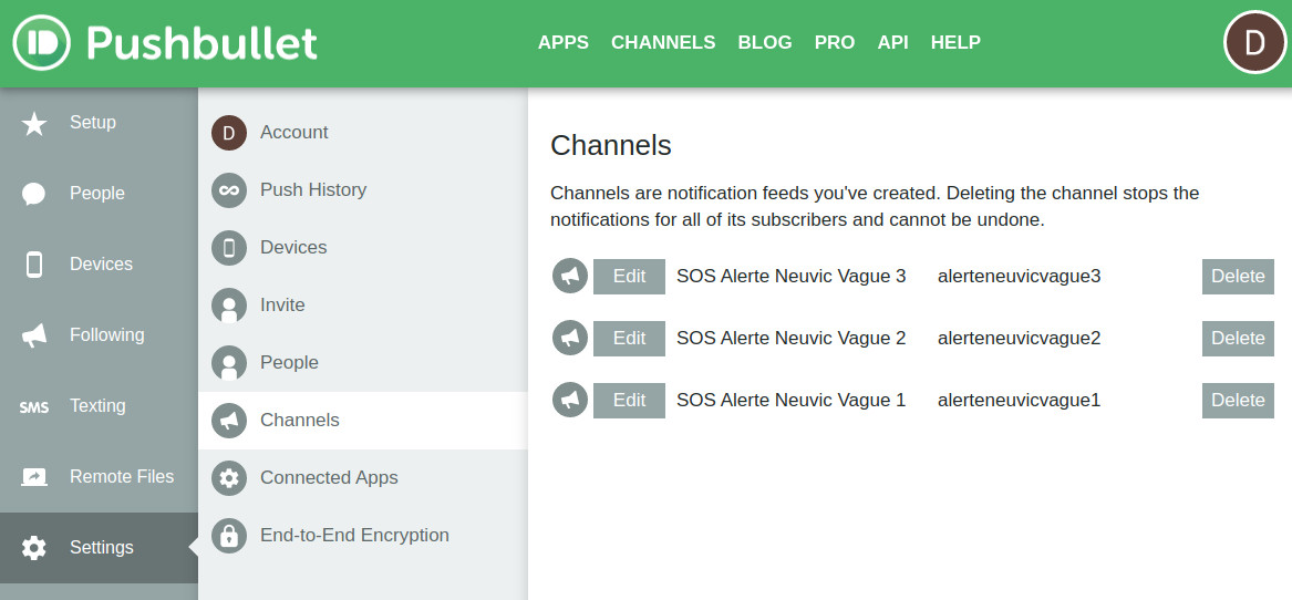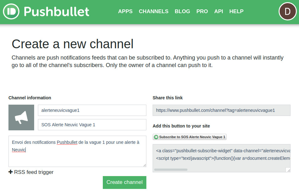 - Création des canaux pour le compte Pushbullet du lieu de l’alerte – OK