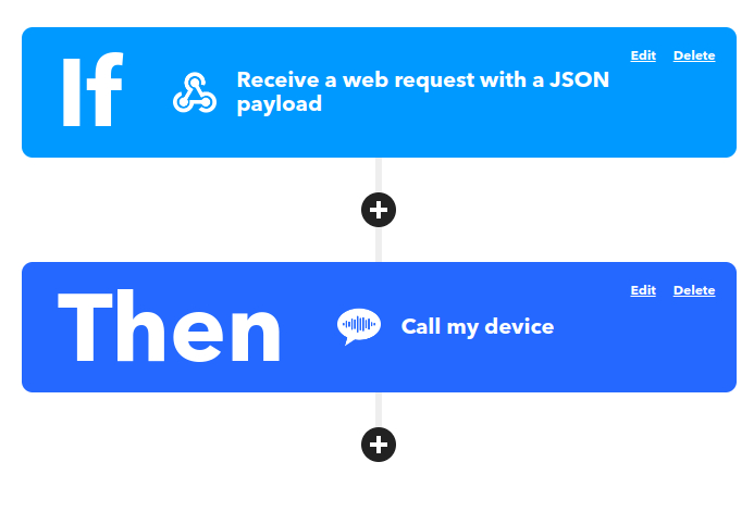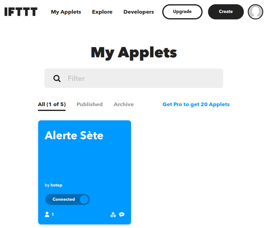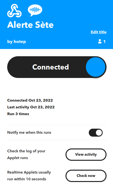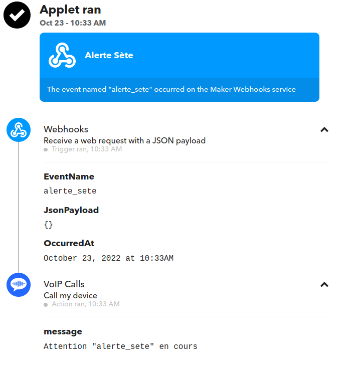 Point 8 : Pour faire sonner le téléphone du destinataire d’une alerte, il faut créer un compte IFTTT gratuit – If This Then That – (donc avec 5 applets/recettes personnalisées maximum) pour chaque destinataire et ajouter une applet qui lance un appel VoIP sur le téléphone lorsqu’une requête web contenant une valeur pré-définie est reçue sur le compte du destinataire.