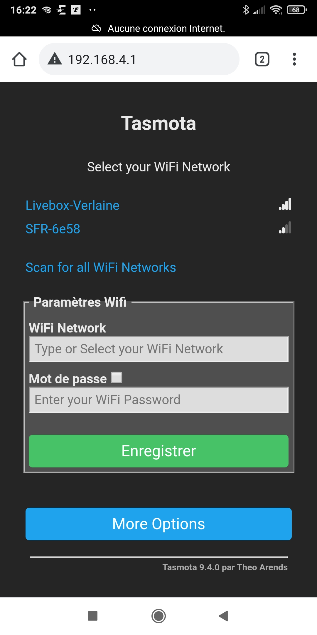 Après le flashage, il faut enlever le FTDI232, remettre le switch sur ON et rebrancher sans appuyer sur reset. Le firmware Tasmota va lancer un wifi AP (Access Point) sur lequel nous allons nous connecter avec un smartphone, puis ouvrir l’adresse du Sonoff-Tasmota (192.168.4.1) dans un navigateur pour paramétrer notre wifi.