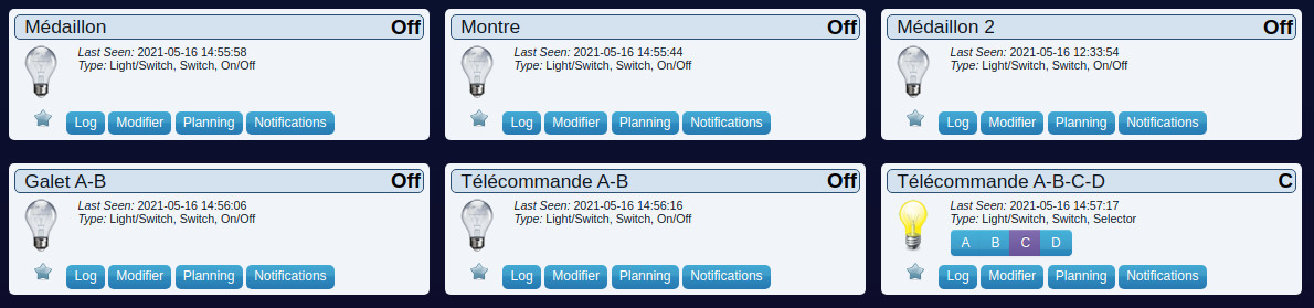 Voici les essais réalisés dans Domoticz, le Médaillon, le Médaillon 2 et la Montre n’ont qu’un seul bouton qui enverra ON à chaque pression; le Galet A-B et la Télécommande A-B envoient ON lors d’un appui sur A et OFF pour un appui sur B et la Télécommande A-B-C-D pilote un switch selector avec 4 valeurs. C’est moi qui choisit le mode de fonctionnement et qui indique les règles.