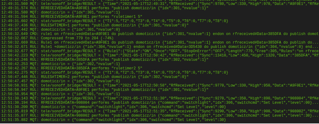 rule1 on rfreceived#Data=A9F0E1 do publish domoticz/in {"idx":301,"nvalue":1} endon on rfreceived#Data=385DFA do publish domoticz/in {"idx":302,"nvalue":1} endon on rfreceived#Data=385DFA do ruletimer2 5 endon on rules#timer=2 do publish domoticz/in {"idx":302,"nvalue":0} endon on rfreceived#Data=EFD5E4 do publish domoticz/in {"idx":303,"nvalue":1} endon on rfreceived#Data=EFD5E4 do ruletimer3 5 endon on rules#timer=3 do publish domoticz/in {"idx":303,"nvalue":0} endon on rfreceived#Data=3D54C0 do publish domoticz/in {"idx":304,"nvalue":1} endon on rfreceived#Data=3D5430 do publish domoticz/in {"idx":304,"nvalue":0} endon on rfreceived#Data=697FA4 do publish domoticz/in {"idx":305,"nvalue":1} endon on rfreceived#Data=697FA2 do publish domoticz/in {"idx":305,"nvalue":0} endon rule2 on rfreceived#Data=908004 do publish domoticz/in {"command":"switchlight","idx":306,"switchcmd":"Set Level","level":00} endon on rfreceived#Data=908001 do publish domoticz/in {"command":"switchlight","idx":306,"switchcmd":"Set Level","level":10} endon on rfreceived#Data=908008 do publish domoticz/in {"command":"switchlight","idx":306,"switchcmd":"Set Level","level":20} endon on rfreceived#Data=908002 do publish domoticz/in {"command":"switchlight","idx":306,"switchcmd":"Set Level","level":30} endon |