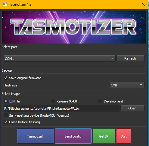 Pour flasher le firmware, j’ai utilisé Tasmotizer sur PC (je n’ai pas réussi à l’installer sur raspberry 🙄 ). C’est assez simple, il faut appliquer les consignes (câblage, 3.3v et switch sur OFF) et bien appuyer sur le bouton reset pendant que l’on branche l’alimentation, la led bleue ne doit pas clignoter.