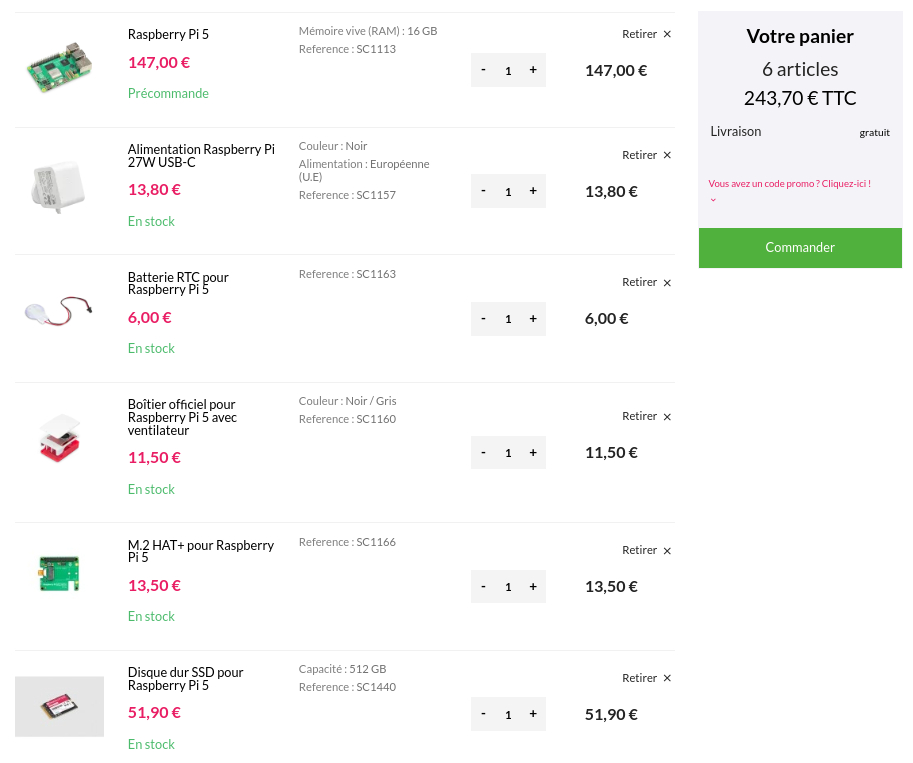 Le tableau ci-dessous montre qu’un Pi 5 avec 16Go de mémoire, un disque SSD de 512Go et les autres éléments indispensables (boitier, alim, hat) revient aujourd’hui à 244€.