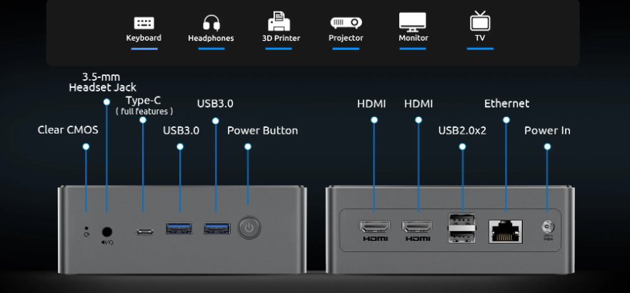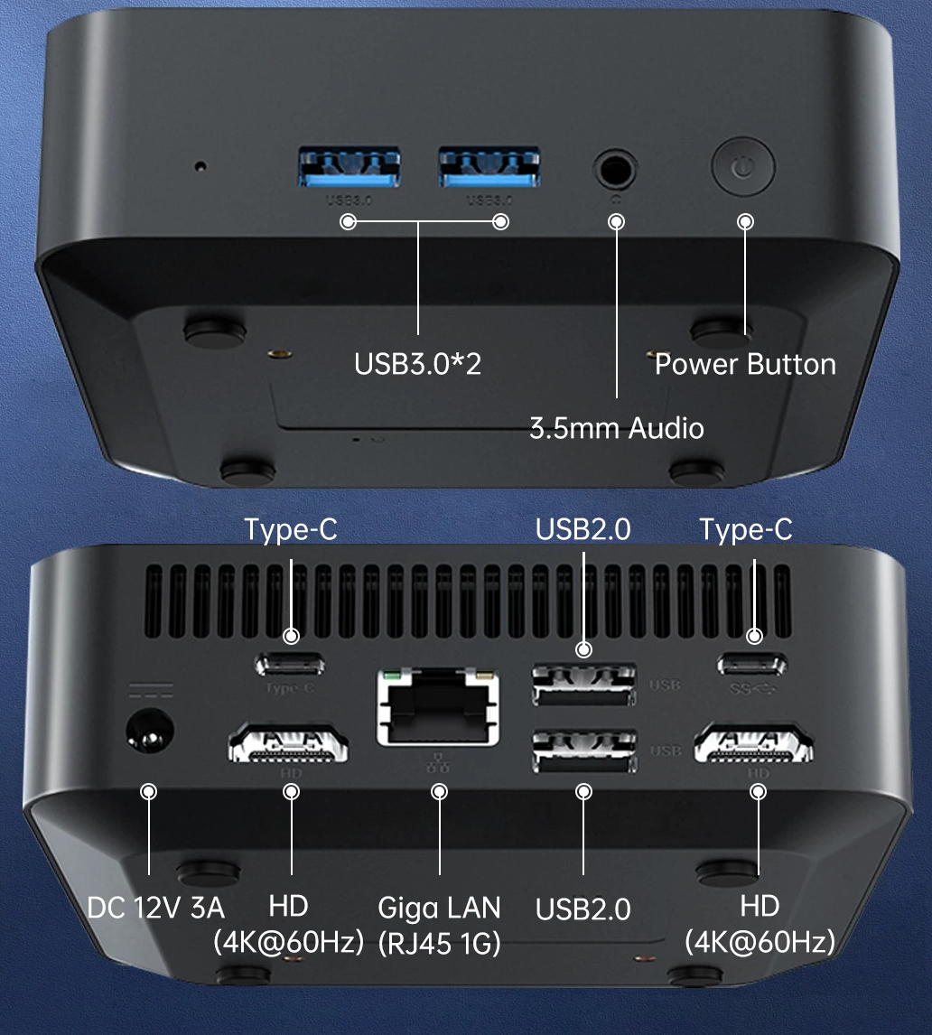 • le display port USB-C qui permet l’utilisation d’un seul câble entre le mini-PC et l’écran car l’alimentation passe par le câble USB. C’est aussi un inconvénient car cela peut perturber l’alimentation du BMAX.