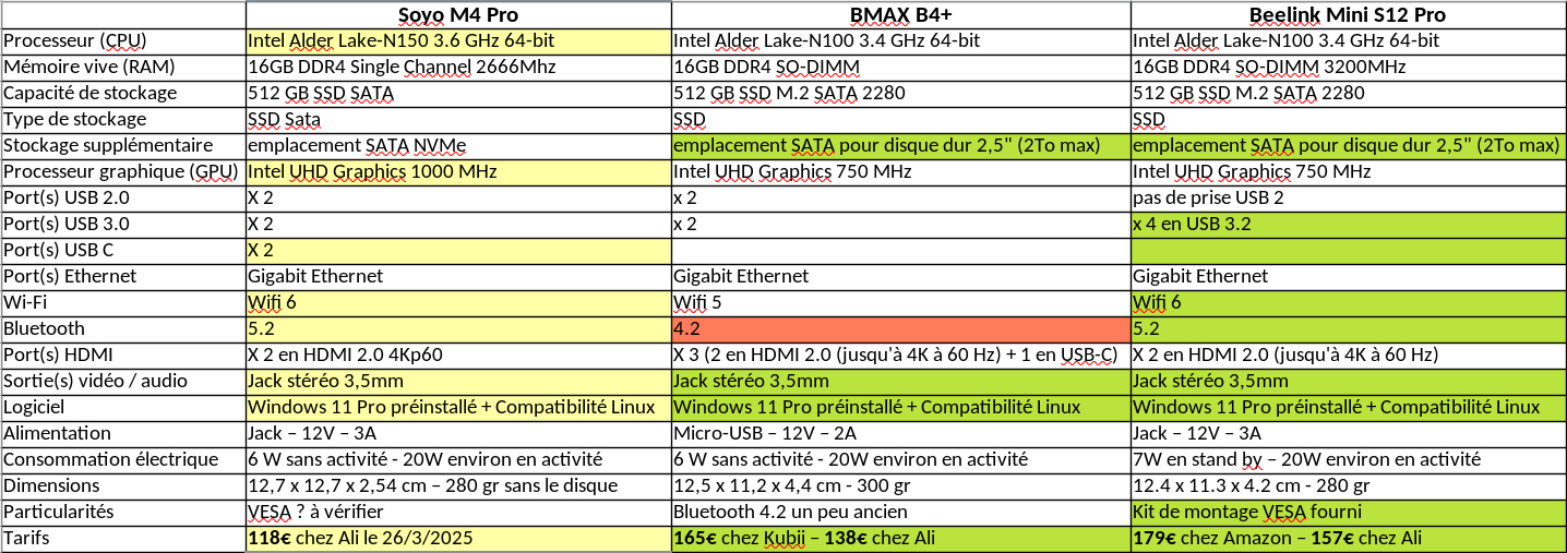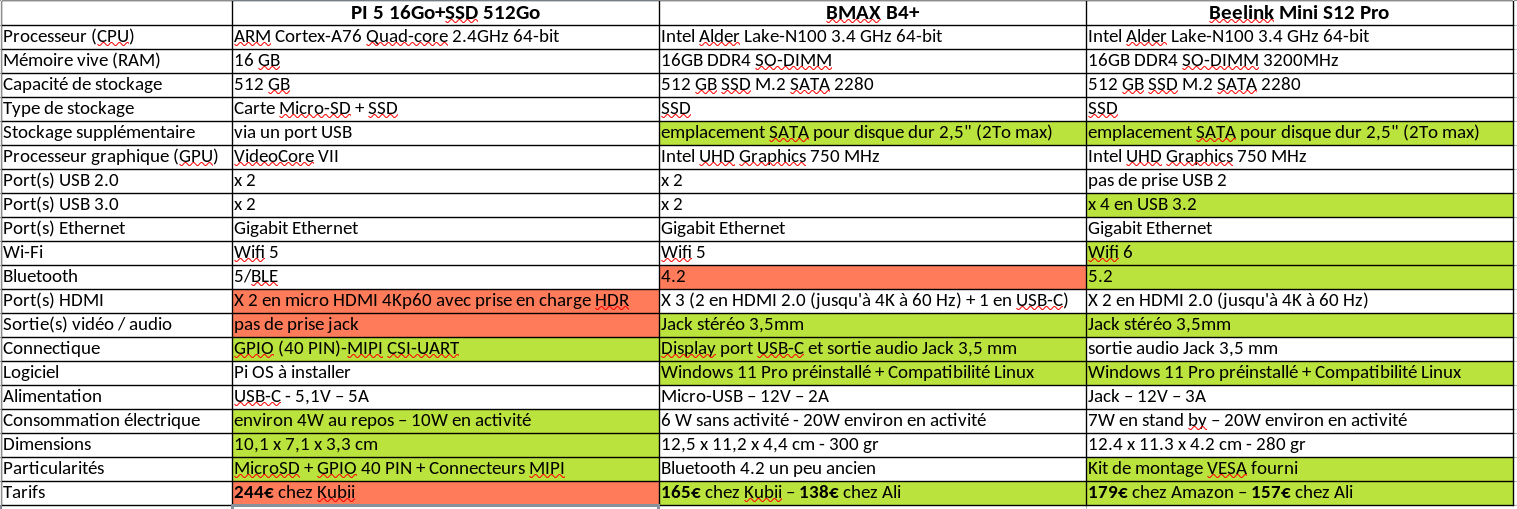 J’ai choisi 2 alternatives en mini-PC avec processeur Intel N100 et dans le tableau suivant on peut comparer le Pi 5 et les 2 mini-PC.