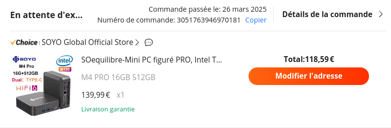 J’ai commandé plus tôt que prévu et j’ai choisi le Soyo M4 Pro qui était en promo sur Aliexpress à 118€59 😆